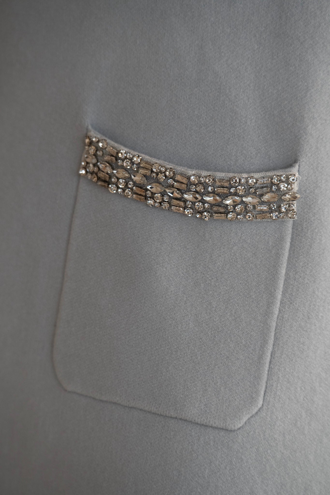 Realizzato in maglia morbida, presenta una linea semplice e pulita impreziosita dal colletto ricoperto di cristalli e dalle patte tasche decorate, che aggiungono un tocco sofisticato e luminoso.