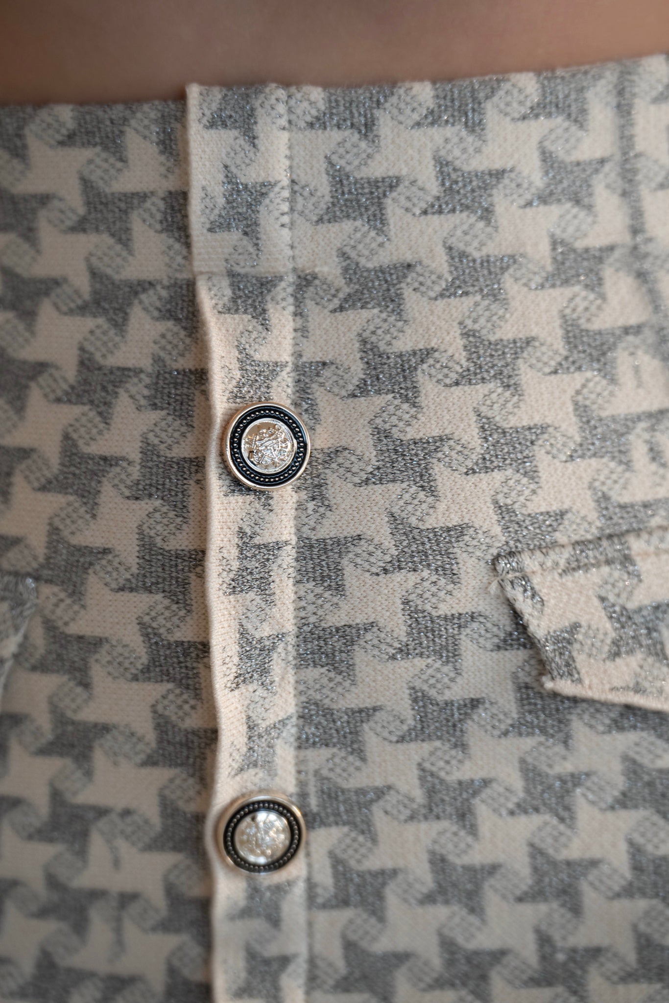 Realizzata in tweed color avorio con motivo pied-de-poule grigio chiaro, presenta una vita alta che slancia la figura e una chiusura frontale decorata da bottoni dorati dal design prezioso.